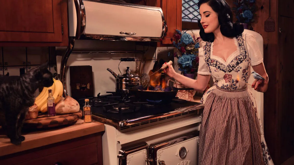 Ungewohnt angezogen: Burlesque-Star Dita Von Teese trägt Kleider von Lena Hoschek - darunter sogar ein Dirndl.