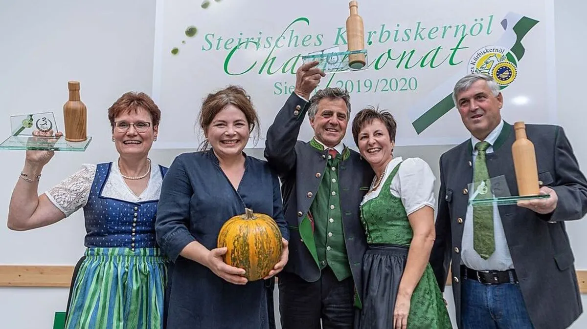 Zum ersten Mal gab es beim Kürbiskernöl-Championat mit Anton und Regina Zöbl einen Zweifach-Sieger. Teil der prominenten Jury war Starköchin Maria Groß (zweite von links)