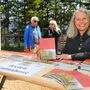 Christa Kolb vor den "Suchbildern" der Ausstellung, wo die Namen von Klauberfrauen dazugeklebt werden können