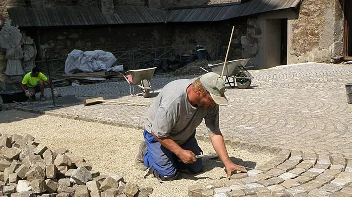 Es sind 15.000 Pflastersteine, die derzeit vor der Pfarrkirche St. Oswald, der Oswaldikirche in Eisenerz, verlegt werden. "Wir wollen einen Platz haben, wo wir Agapen nach Hochzeiten oder Taufen abhalten können", erzählt Pfarrer Anton Reinprecht, ehe er Richtung Traktor verschwindet, "um noch schnell ein paar Steine aufzulegen." Franz Haidn senior setzt sich mit dem Gefährt in Bewegung. "Er ist einer von den treuen Helfern wie auch Hubert Kohlmaier und Konrad Spannring. Es helfen glücklicherweise schon auch andere, einige wenige mit, wenn ich sie anspreche, aber der harte Kern ist klein. Das ist schade", erzählt Harold Umfer, Obmann des Vereines zur Rettung der Wehranlage und der Pfarrkirche St. Oswald. Der ehemalige Bergdirektor der VA Erzberg ist der "Motor" des Sanierungsprojekts "Oswaldikirche". Seit acht Jahren sammelt er Spenden, kurbelt um Subventionen, verhandelt mit Firmen. In diesen Funktionen fühlt er sich wohl in seiner Haut. Nicht so, wenn er in der Öffentlichkeit steht.