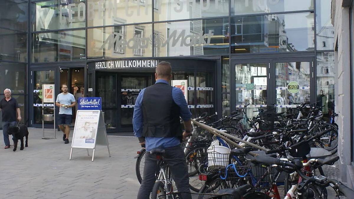 Das tägliche Fahrrad-Chaos beim Haupteingang des Einkaufszentrums LCS in Leoben