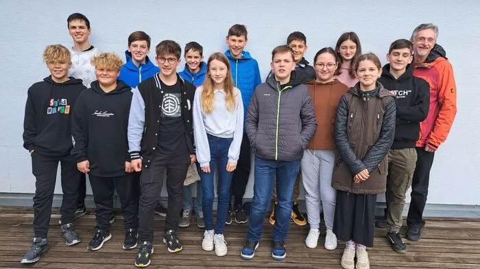 Die erfolgreichen Nachwuchsmusikerinnen und -musiker mit Bezirkkskapellmeister Vinzenz Keimel (r.)