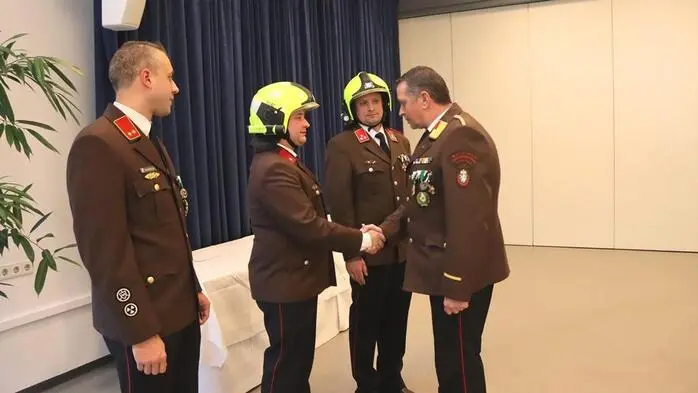 • Es wurden mehrere Feuerwehrleute für ihre Verdienste mit Medaillen ausgezeichnet.