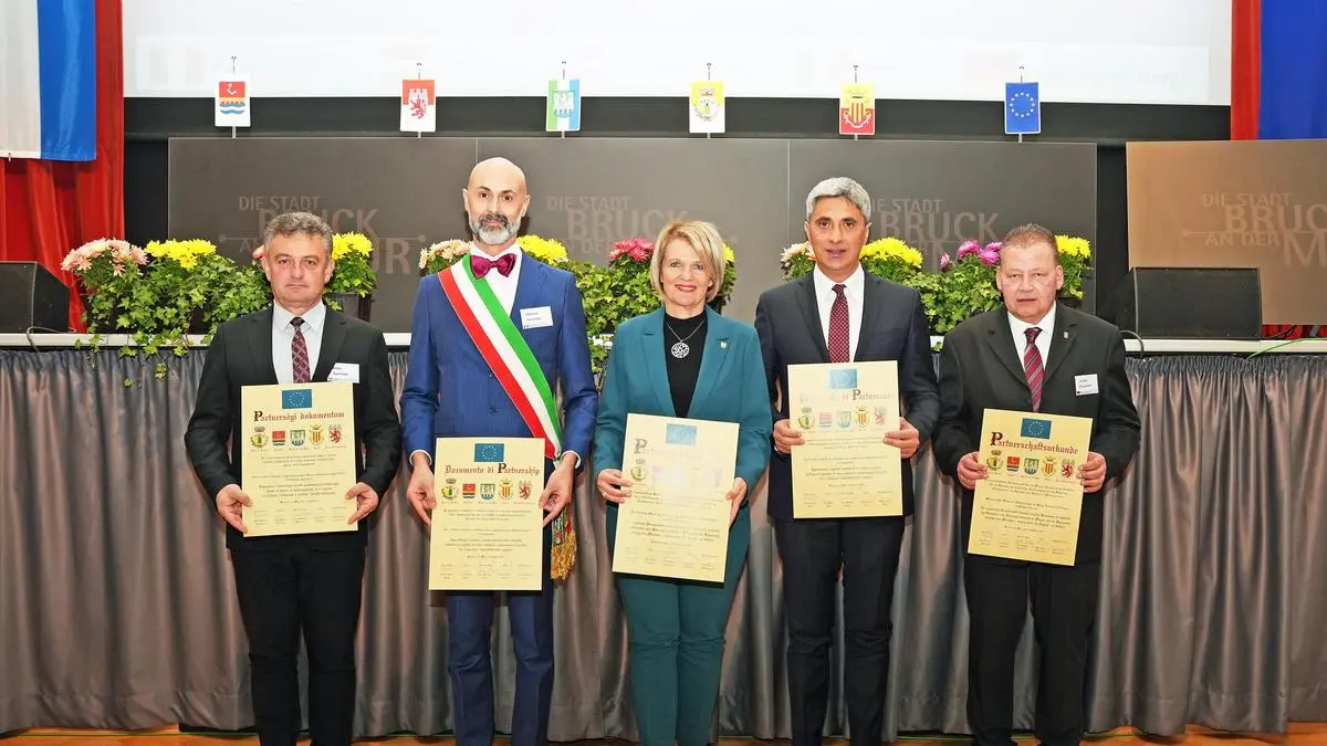 In einem Festakt wurden die Partnerschaften der Bezirkshauptstadt Bruck mit Hagen-Hohenlimburg, Farra d‘Isonzo, Veroli und Zalalövö erneuert und neue Projekte in Aussicht gestellt.