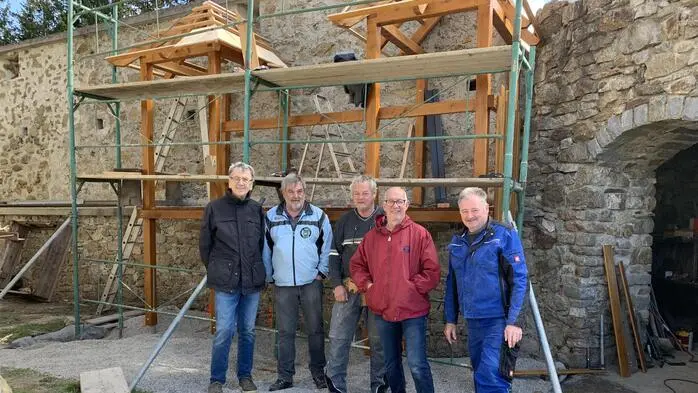 Obmann Wolfgang Ulrich (2. v. r.), Kassier Kurt Fladl (links), Beirat Jakob Posch (rechts) und Helfer sind auf der Burg im Einsatz