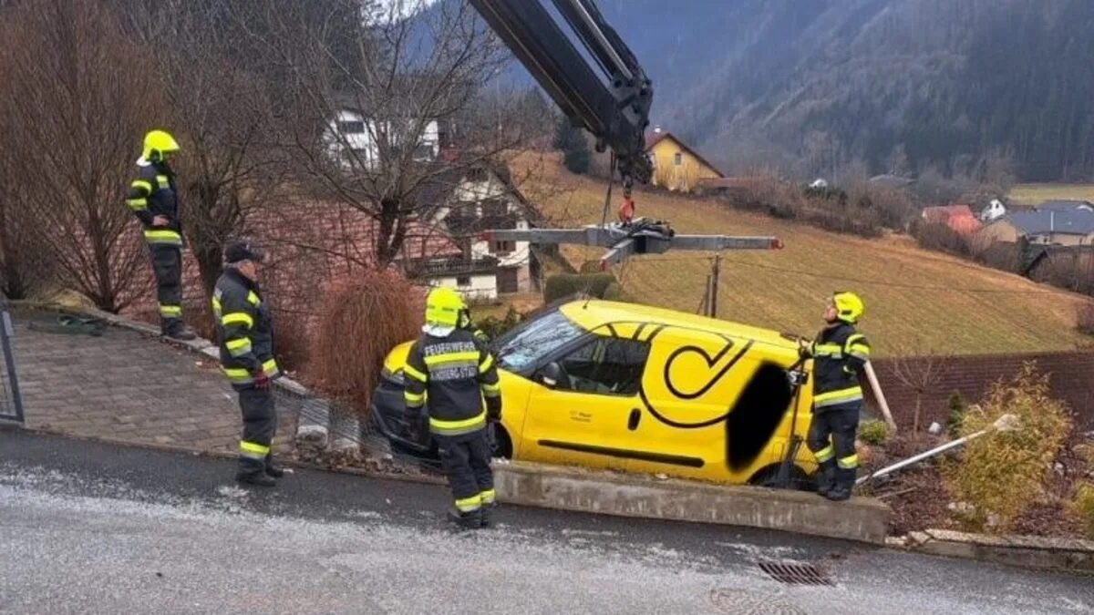 Ein Postauto setzte sich offenbar von alleine in Bewegung und landete so unglücklich hinter einer Mauer, dass die Feuerwehr mit Spezialfahrzeug anrücken musste.