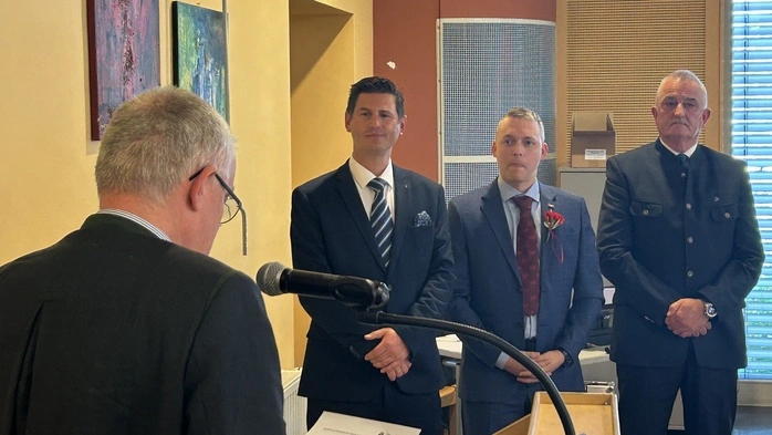 Bezirkshauptmann Bernhard Preiner lobte den neuen Bürgermeister und seine Stellvertreter an: Arno Russ (ÖVP), Christoph Bammer (SPÖ) und Ernst Ebner (FPÖ)