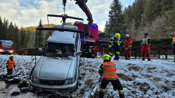 Die Feuerwehr schätzt, dass winterliche Straßenverhältnisse im Bereich einer Kurve zum Verhängnis wurden: Das Fahrzeug landete jedenfalls im Großveitschbach. „Die Personen konnten sich selbst befreien, das ging auch aus der Alarmierung hervor“, erklärt Kommandant Gernot Rechberger von der Freiwilligen Feuerwehr Veitsch.