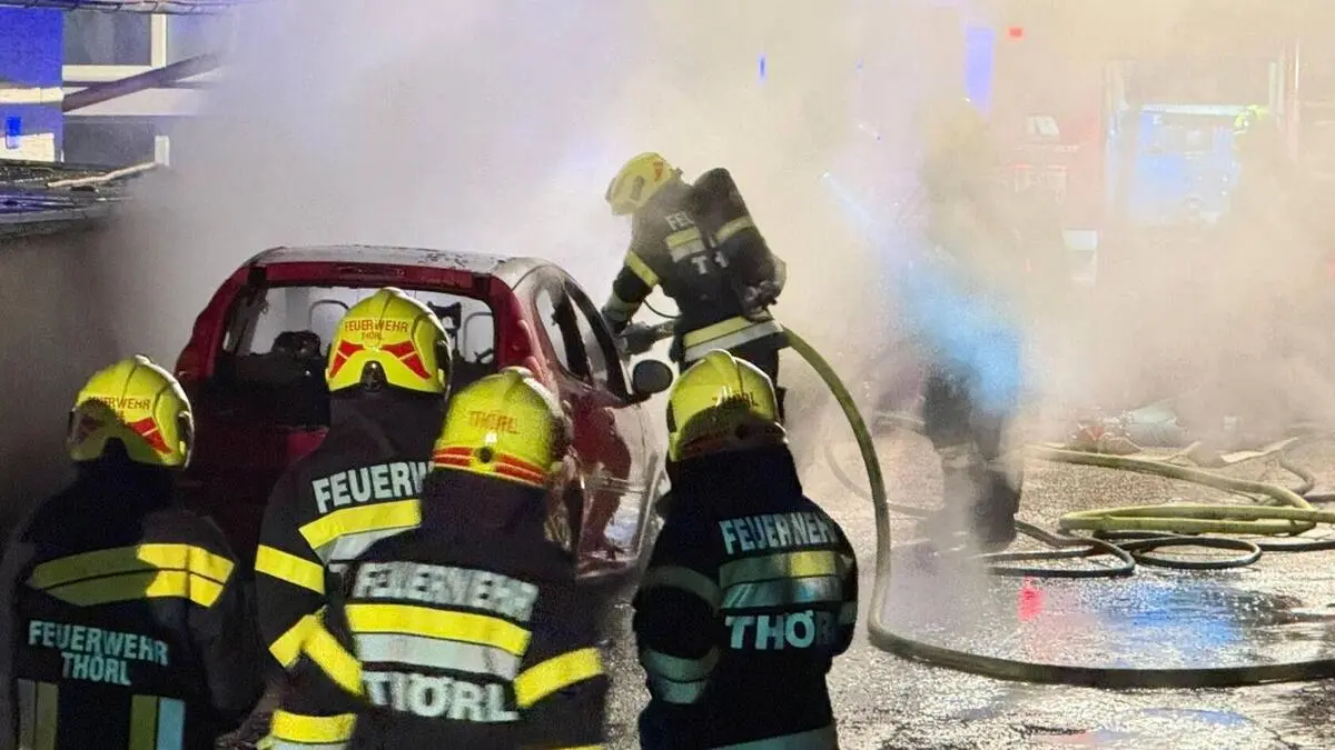 Ein Fahrzeugbrand im Ortsgebiet, der auch eine Garage bedrohte, rief am Dienstag in den Nachtstunden die Feuerwehren Thörl und Aflenz auf den Plan.