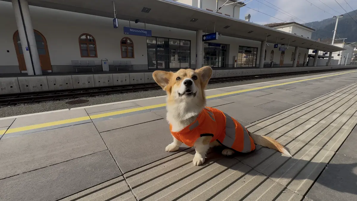 Der Corgi darf als Diensthund ehrenhalber regelmäßig in die Arbeit am Bahnhof in Mürzzuschlag „reinschnuppern“. Dabei stößt der kleine Hund auf große Begeisterung.