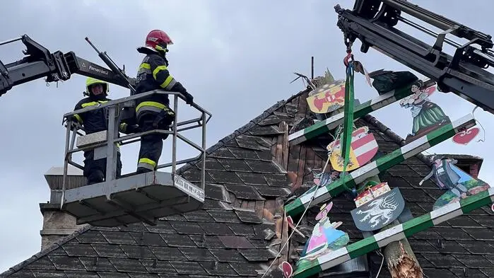 Wahrzeichen von Kindberg fiel um und blieb in Hausdach stecken