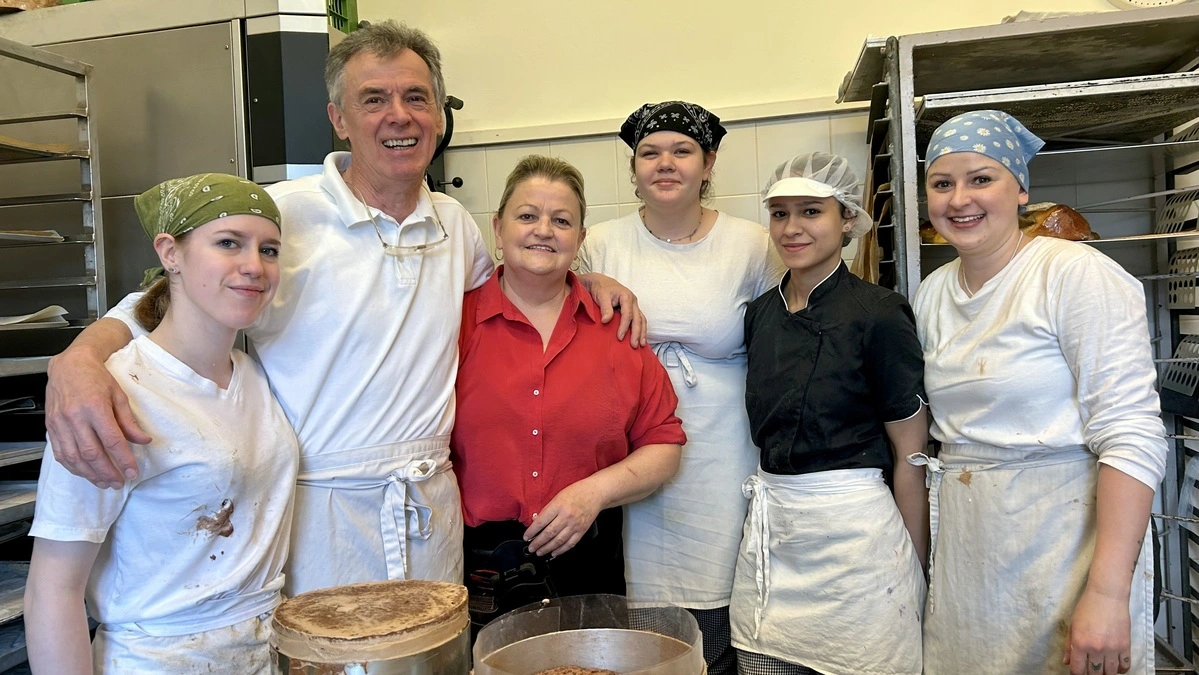 Rupert Mandl (zweiter von links) betreibt die Konditorei mit seiner Frau Heidi (dritte v. links), seiner Tochter Hanna Mandl (ganz rechts) und einigen Mitarbeiterinnen