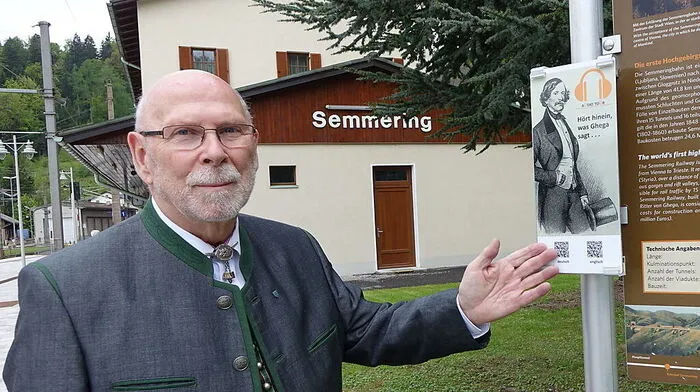 Carl Ritter von Ghega erklärt am Bahnwanderweg die Semmeringbahn. Man muss nur den QR-Code auf den Schildern mit dem Handy scannen.