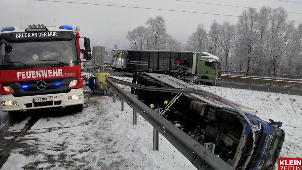 Wegen des Schneefalls kam ein LKW auf der S6 von der Straße ab und blieb seitlich liegen. Mehrere tausend Liter Milchprodukte mussten von der Feuerwehr umgeladen werden.