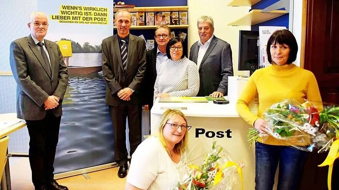Maria Pink und Sandra Donnée (im Vordergrund) werden die Poststelle betreuen, dahinter die Vertreter von Post, Gemeinde und Politik