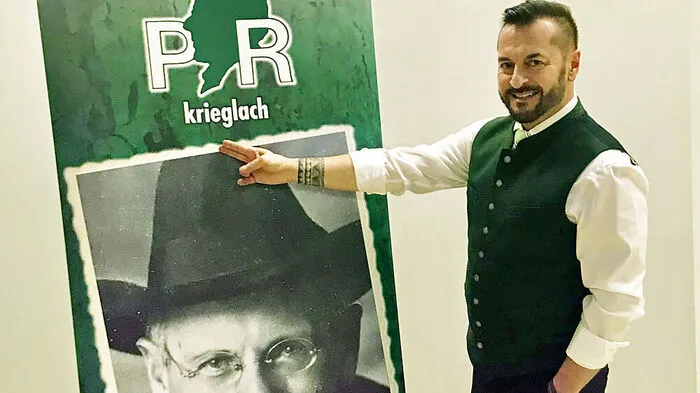 Obmann Franz Preitler vor einem Plaket des Roseggerbundes