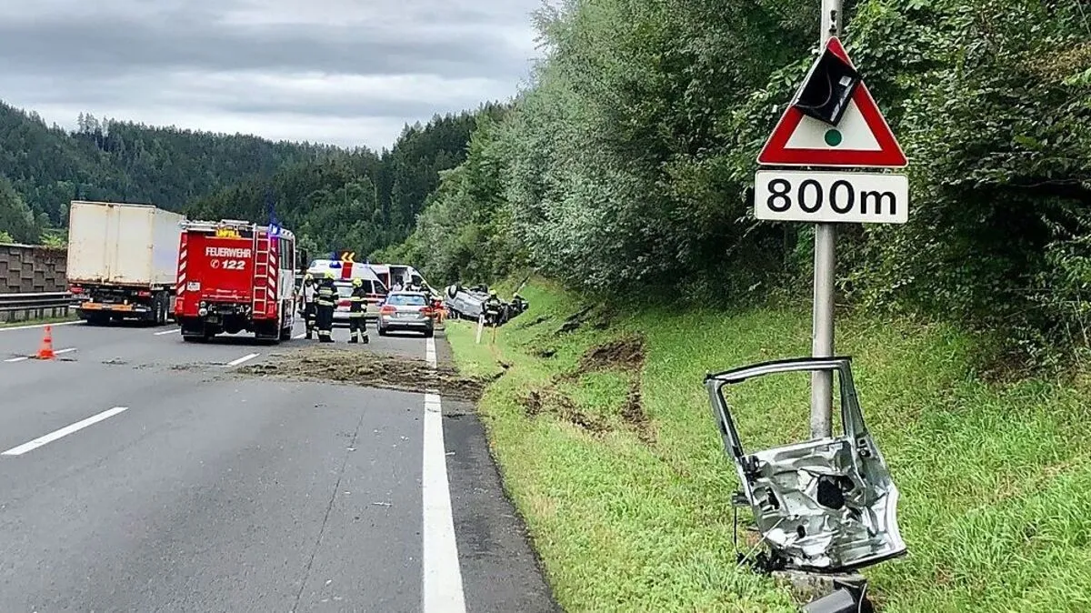 Ein Pkw kam in Fahrtrichtung Tanzenbergtunnel von der Fahrbahn ab und überschlug sich. Verletztes Ehepaar ins LKH Bruck eingeliefert.