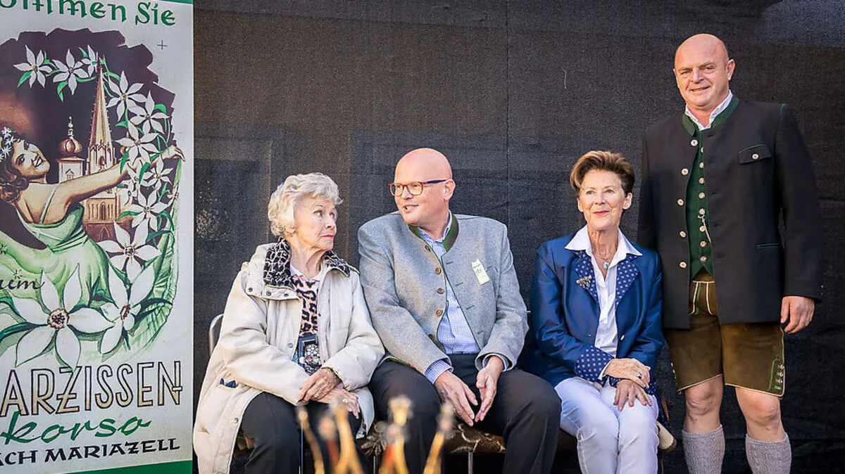 300 Besucher bei Festakt im Heimathaus Mariazell mit Übergabe der Narzissenkrone durch Waltraut Haas und Ingrid Wendl, die Narzissenhoheiten von 1959. Anlass war die Eröffnung des neuen Naturkundemuseums.