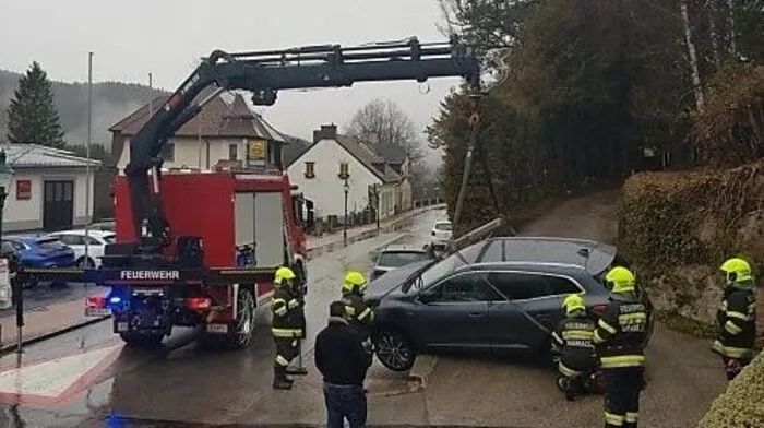 Weil ein Auto auf einem Mauervorsprung festsaß, rückte in Mariazell die Feuerwehr aus.