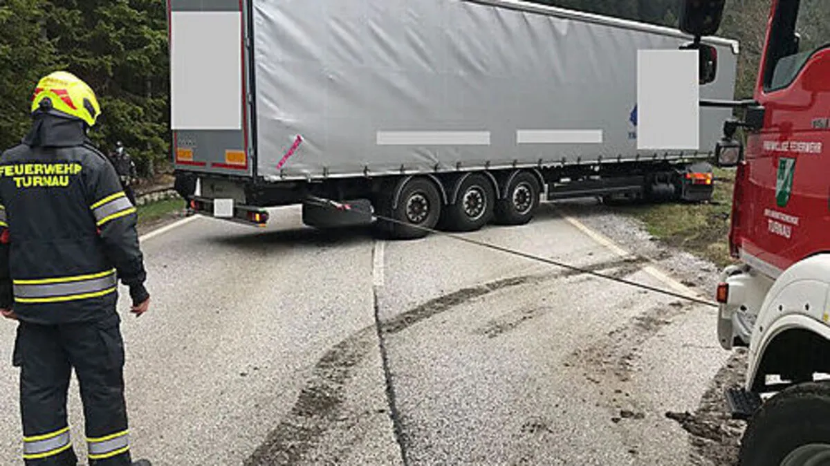 Ein Sattelzug kam aus einer Ausweiche auf der Seebergstraße nicht mehr heraus. Er blockierte die Fahrbahn, die FF Turnau zog ihn mit der Seilwinde zurück auf die Fahrbahn.