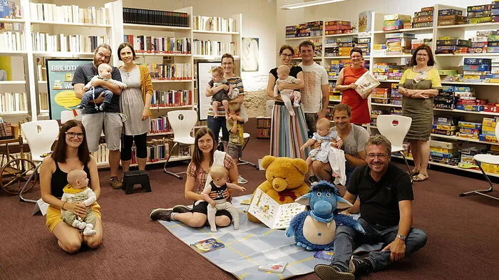 Bürgermeister Peter Koch (vorne), Büchereileiterin Silke Reitbauer-Rieger (2.v.r. hinten) und Büchereimitarbeiterin Birgit Wenger (r.) hießen die neuen Erdenbewohner mit ihren Eltern in der Brucker Stadtbücherei willkommen