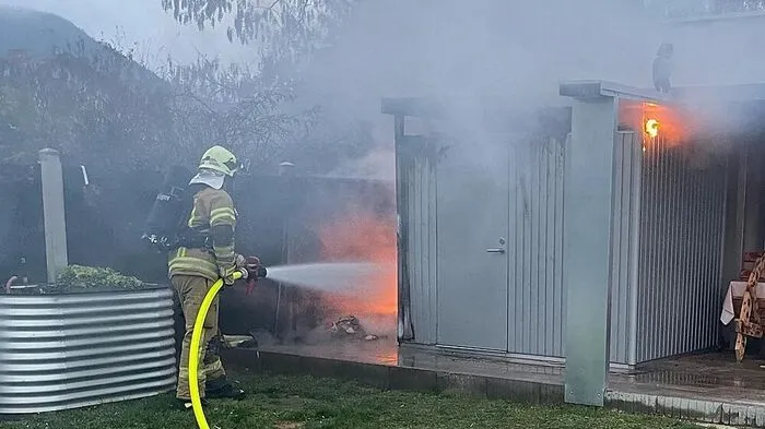 Müllcontainer stand in Flammen, Gartenhütte und Zaun beschädigt