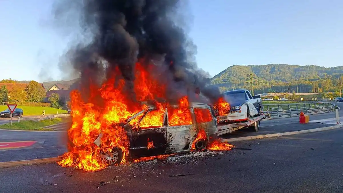 Ein Pkw mit Anhänger begann im Ganzsteintunnel zu brennen. Der Fahrer fuhr noch aus dem Tunnel und hielt sein Fahrzeug erst draußen an, wo es von der Feuerwehr gelöscht werden konnte.