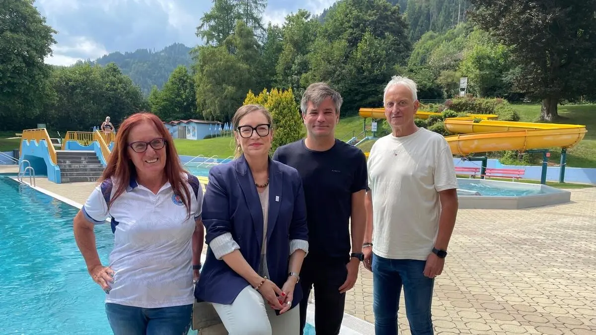 Dagmar Puffing (Atus), Bürgermeisterin Elke Florian, Nationalratsabgeordneter Wolfgang Moitzi und Atus-Vorsitzender Gernot Pirkwieser im Schwimmbad Judenburg