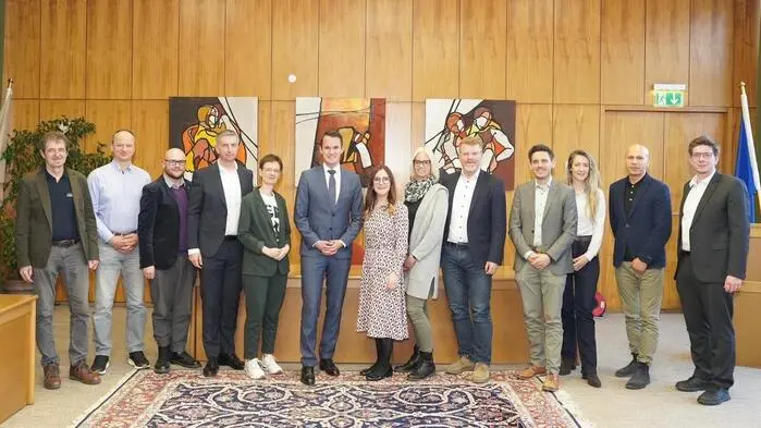 Bildungsgipfel im Knittelfelder Rathaus: Landesrat Stefan Hermann (M.), links von ihm Bildungsregion-Chefin Ulla Steinwidder, Bürgermeister Harald Bergmann (5. v. r.), daneben Vizebürgermeister Dominik Modre. Im Bild mit Pädagogen, Vertretern weiterer Parteien und des Integrationsfonds