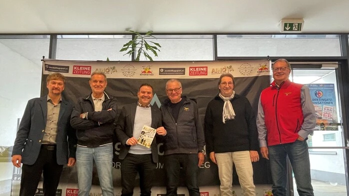Stehen hinter der Ainova 2026: Messeleiter Christian Feuchter, Flightline-Direktor Gerhard Interkörner, Bürgermeister Günter Reichhold, Johann Sieber vom Österreichischen Aeroclub, Gastronom Heinz Liebmann und Herbert Gasperl, der Gestalter des Flugprogramms