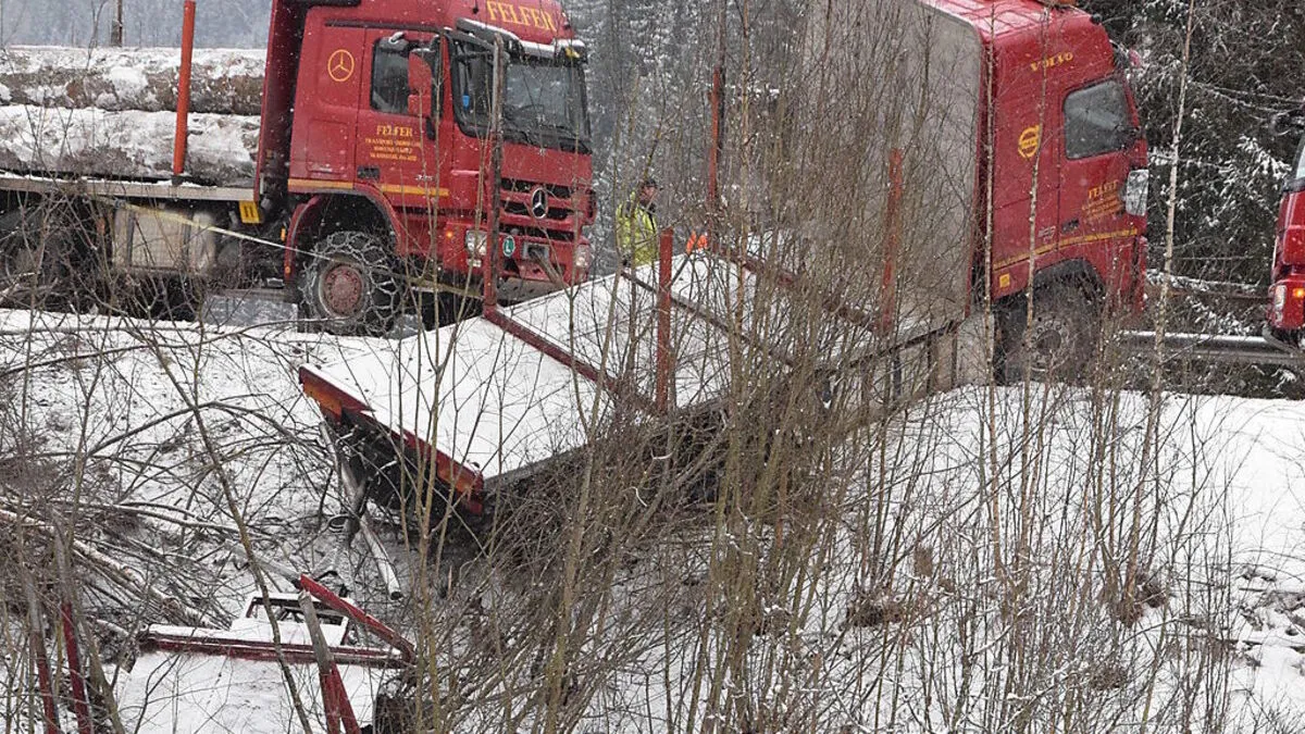 Lkw-Unfall Donnerstagnachmittag bei St. Georgen ob Murau. Verletzt wurde niemand, die Berge- und Aufräumarbeiten gestalteten sich aber schwierig.
