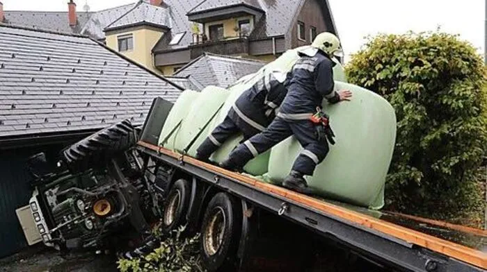 Feuerwehrleute der Wehren Großlobming und Knittelfeld mussten am 7. Oktober zu einem ungewöhnlichen Einsatz ausrücken: Ein Traktor mit einem mit Siloballen beladenen Hänger landete in Garage.