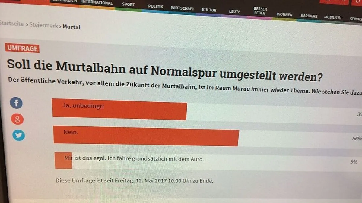 Soll die Murtalbahn auf Normalspur umgestellt werden? Das wollten wir in dieser Woche von unseren Leserinnen und Lesern wissen: 56 Prozent antworteten mit "Nein".