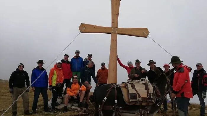 Die Bergfreunde St. Oswald haben das kleine Gipfelkreuz am Lahneck gegen neues Kreuz ausgetauscht. Beim Transport half auch ein Esel.