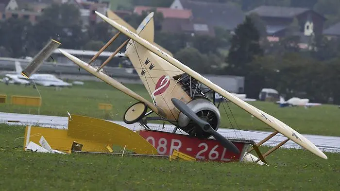 Am Ende einer Flugdarstellung von zwei Maschinen aus der Zeit des Ersten Weltkriegs ist eine schwedische CFM01 'Tummelisa' ('Däumling') beim Landen auf der Graspiste durch eine plötzliche Windböe umgekippt. Der schwedische Pilot blieb unverletzt