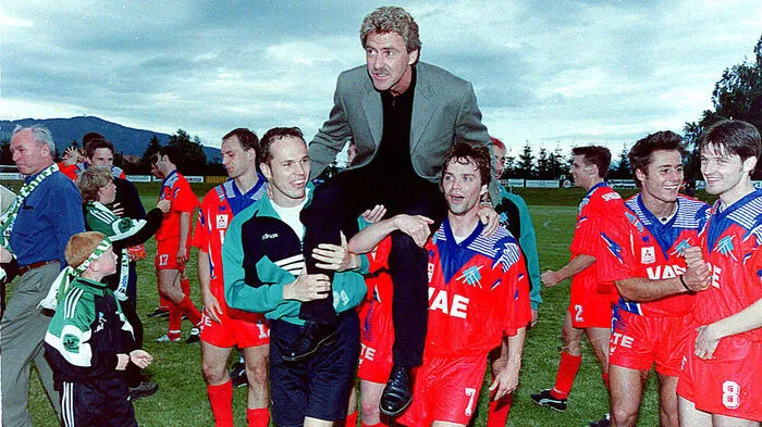 Walter Schachner feierte sein Trainerdebüt 1999 in Zeltweg mit dem Landesligatitel und Aufstieg in die Regionalliga. Geschultert von Keeper Mario Berger (links) und dem heutigen Zeltweger Bürgermeister Günter Reichhold