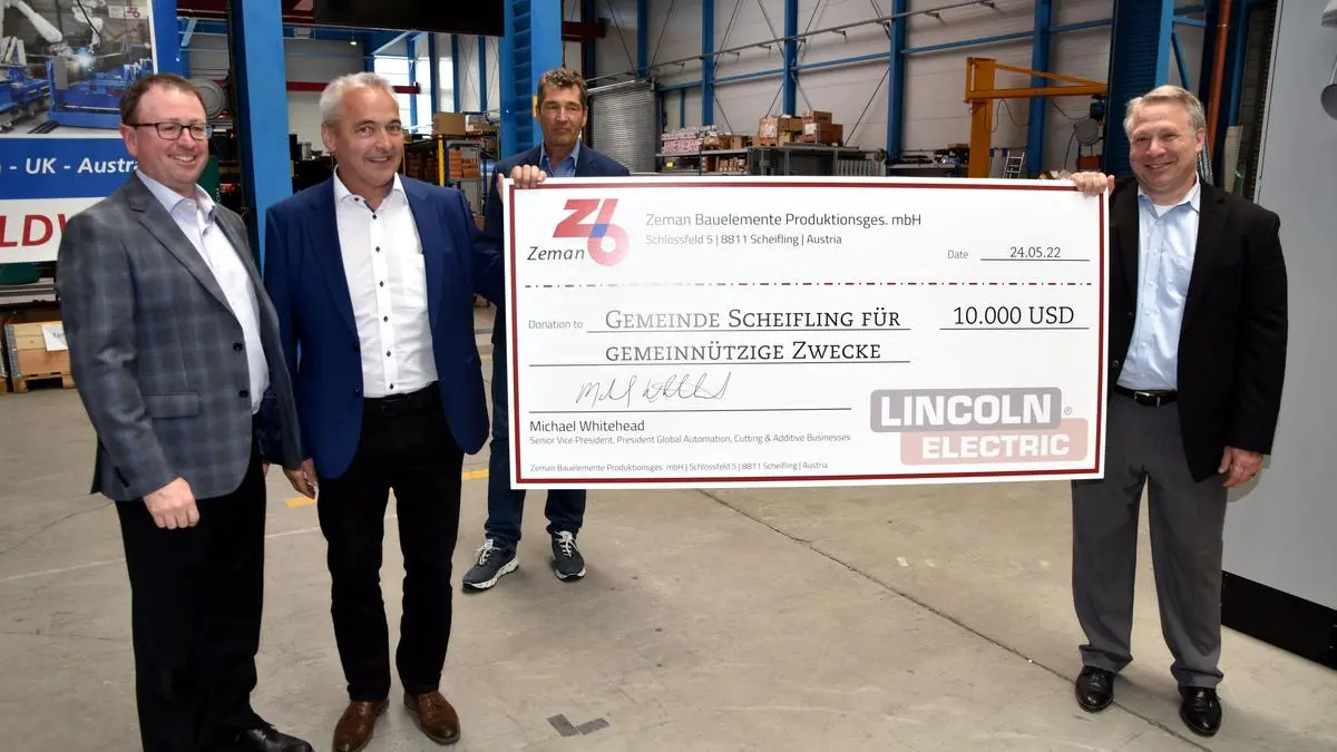 Der US-Konzern Lincoln Electric kaufte im Vorjahr das Scheiflinger Unternehmen Zeman Bau. Der neue Eigentümer kam bei seinem Antrittsbesuch nicht mit leeren Händen, sondern einem fetten Scheck für die Gemeinde.
