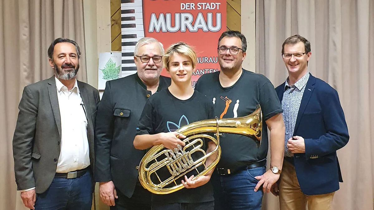 Alexander Pürstl aus Murau (Mitte) freut sich über ein neues Tenorhorn. Übergeben von Helmut Eichmann und Fritz Unterweger. Ebenfalls am Foto: Lehrer Michael Unterweger und Direktor Wolfgang Fleischhacker