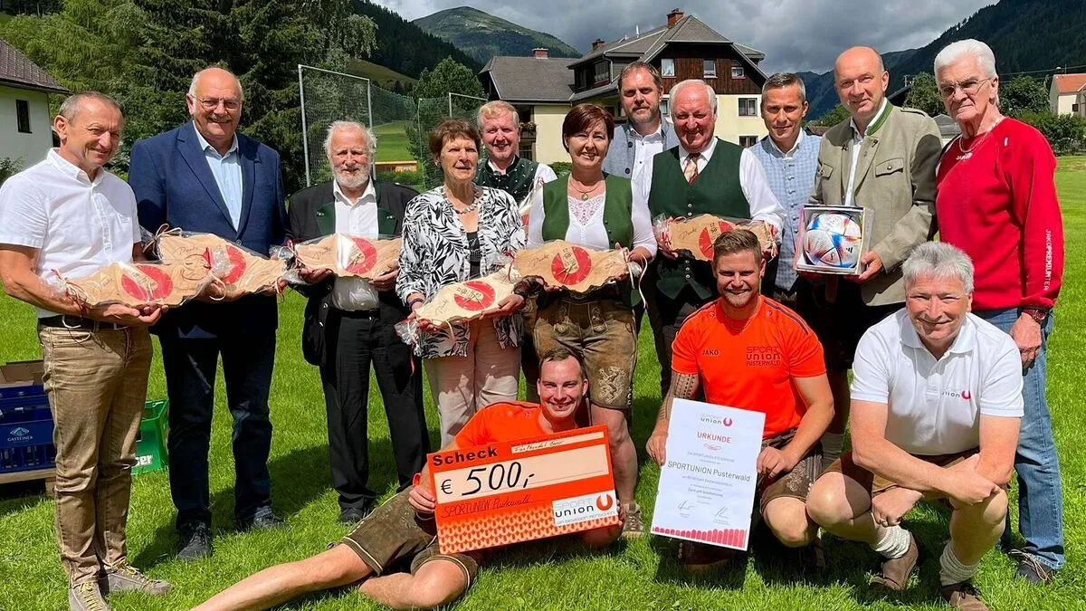 Der amtierende Obmann des USV Pusterwald David Kogler (hockend 2.v.r.) freute sich, dass nicht nur ehemalige Obleute, sondern auch namhafte Ehrengäste bei der “Fünfzigerfeier” des erfolgreichen Sportvereines anwesend waren