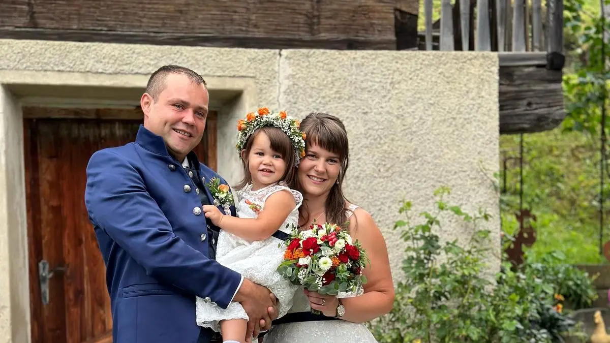 Seit mehr als zehn Jahren sind Tanja und Wolfgang ein Paar. Daheim sind die beiden mit ihrer Tochter Marie auf einem wunderschönen Bauernhof in Hinterburg bei Oberwölz auf 1200 Meter Seehöhe. Dort trifft man das Brautpaar oft beim gemeinsamen Spaziergang mit der Familie und der Hochgebirgs-Mastsau "Rudi".