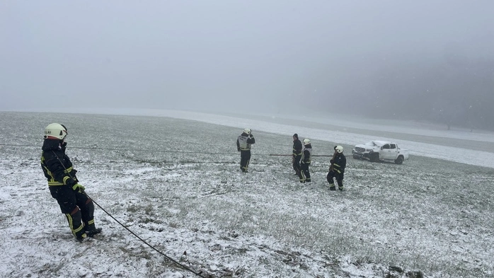 Die Freiwillige Feuerwehr Pöllau war aufgrund des Schneefalls gleich doppelt im Einsatz. Zweimal mussten die Einsatzkräfte Fahrzeuge mit einer Seilwinde bergen.