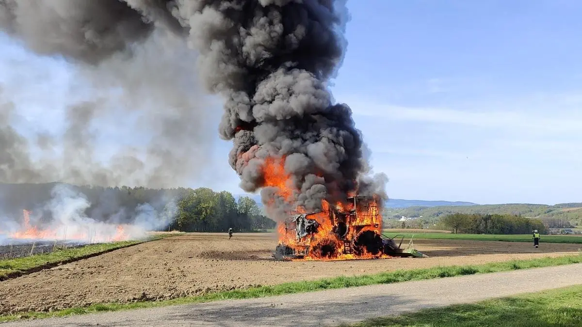 Spektakuläre Bilder lieferte Donnerstagnachmittag ein Brand in Grafendorf: Ein Feldhäcksler hatte während der Erntearbeiten auf einem Elefantengras-Feld in Obersafen kurz nach 16 Uhr Feuer gefangen. Bereits wenige Minuten nach dem Notruf stand die Erntemaschine laut Augenzeugen in Vollbrand. Kilometerweit waren die Rauchwolken zu sehen. Verletzt wurde zum Glück niemand.