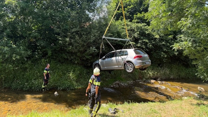 Fahrzeug rollte von Parkplatz und stürzte in den Bach