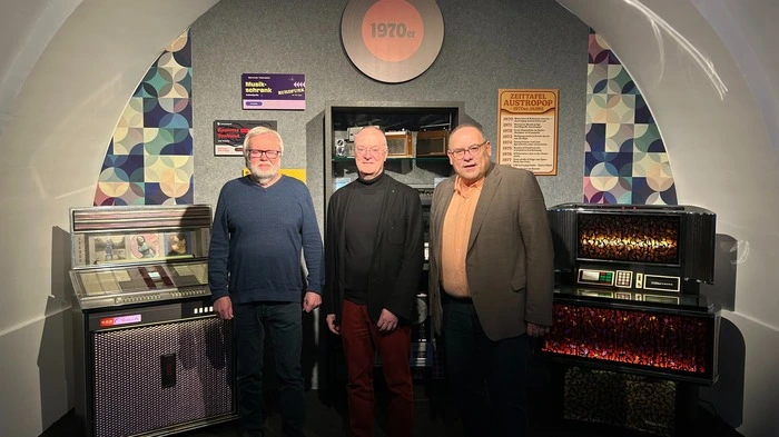 Im Austro-Pop-Museum in Fürstenfeld: Sigi Flamisch mit Friedrich Ohnewein und Johannes Hödl