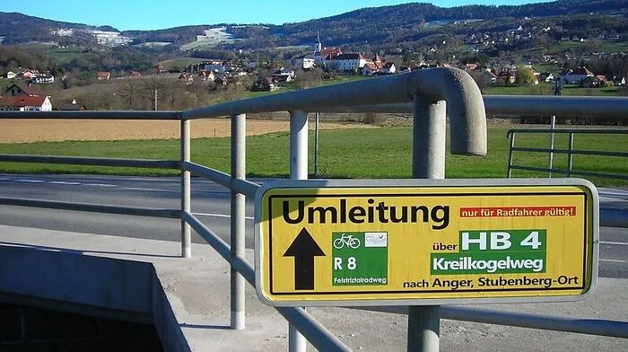 Der von Anger nach Fürstenfeld führende Radweg R 8 ist in der Stubenbergklamm wegen des Neubaus des dortigen Kraftwerks bis Herbst gesperrt. Der Tourismusverband hat eine Umleitung beschildert.