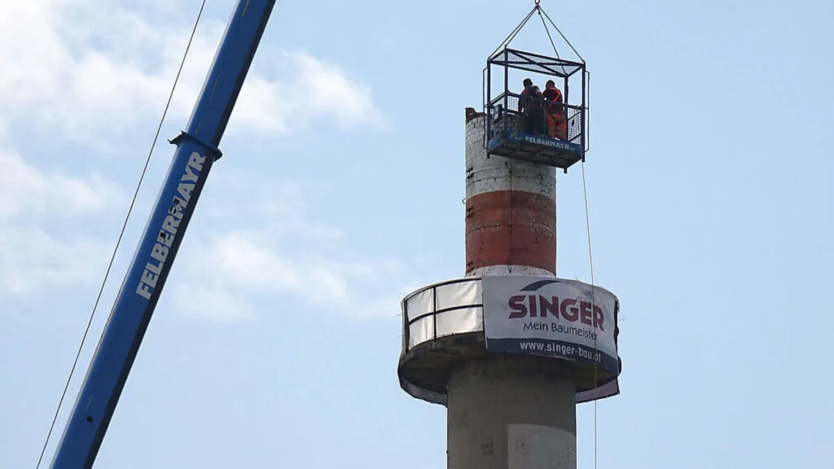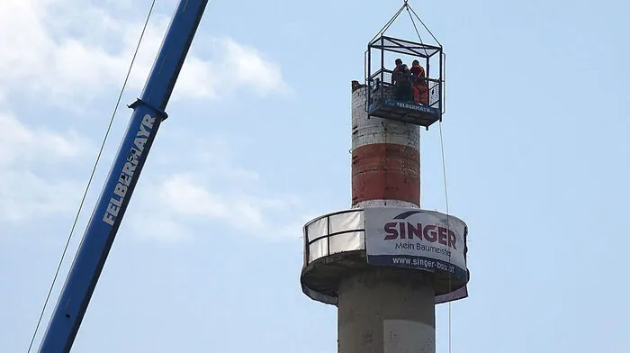 Der Hartberger Teppicherzeuger Durmont kürzt den 56 Meter hohen und seit der Umstellung von Öl auf Gas nicht mehr genutzten alten Schornstein. Die Stadtgemeinde Hartberg begrüßt das.