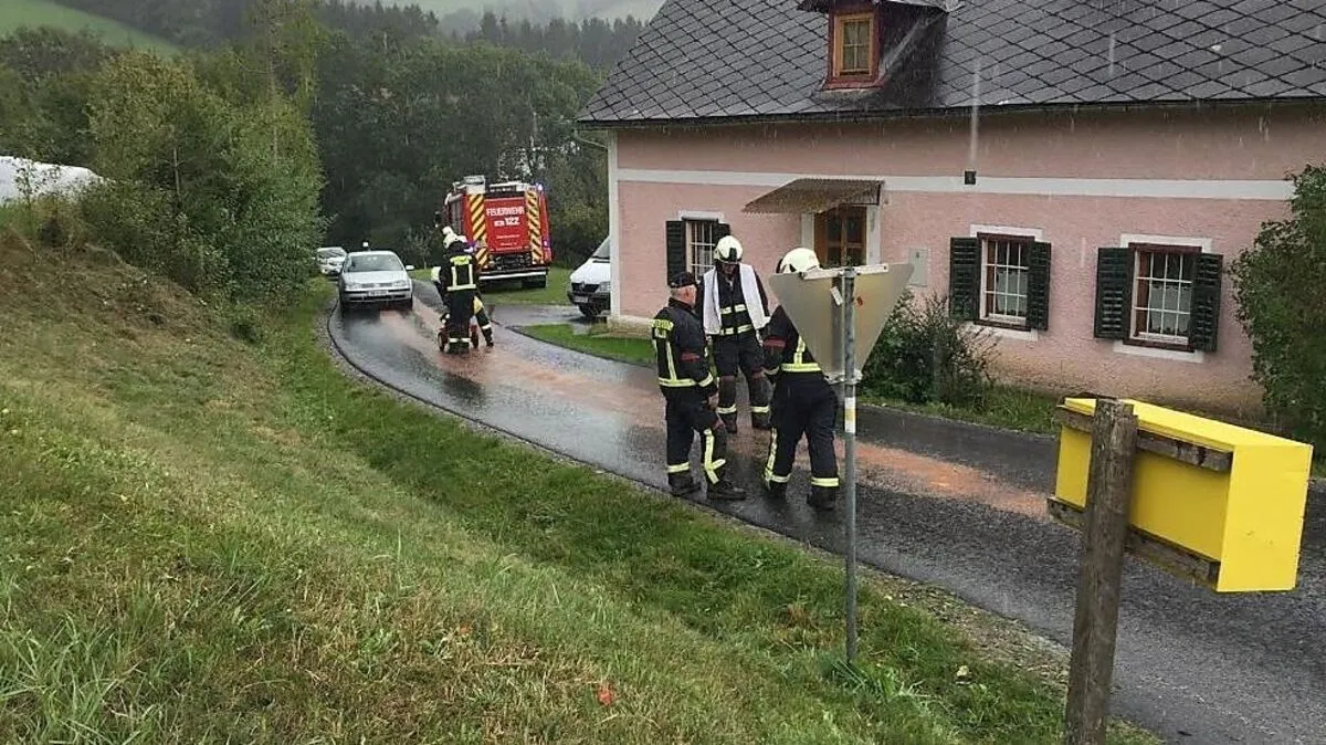 Eine landwirtschaftliche Maschine verlor auf einer regennassen Gemeindestraße bei Pöllau auf mehreren Kilometern Dieselöl. Die Feuerwehr Pöllau konnte die Verschmutzung mit 17 Mann beseitigen.