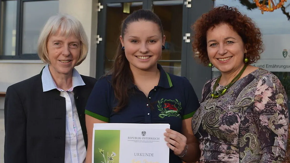 Michaela Falk mit Betreuungslehrerin Marianne Mayer und Direktorin Karin Kohl