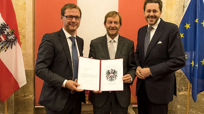 Im Bundesministerium für Wirtschaft, Forschung und Wissenschaft in Wien verlieh Wirtschaftsminister Harald Mahrer dem Hartberger Unternehmer Alfred Fuchs das Staatswappen.