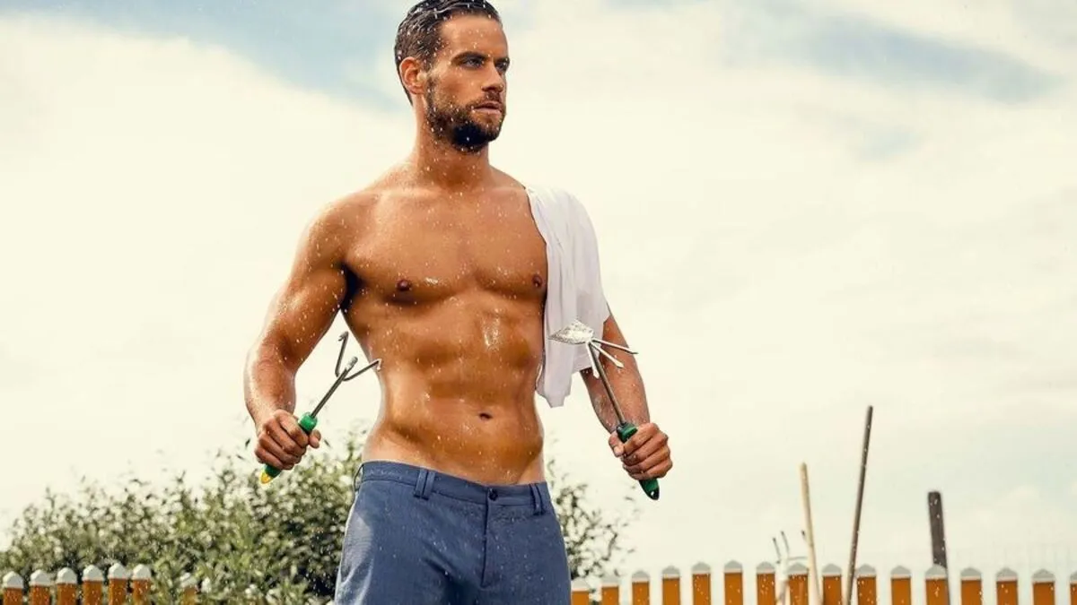 Der Landwirt Stefan Wallner aus Fürstenfeld schmückt im Jungbauernkalender 2019 den Sommermonat August. Während des Fotoshootings gab es für ihn auch eine kalte Dusche mit dem Gartenschlauch.